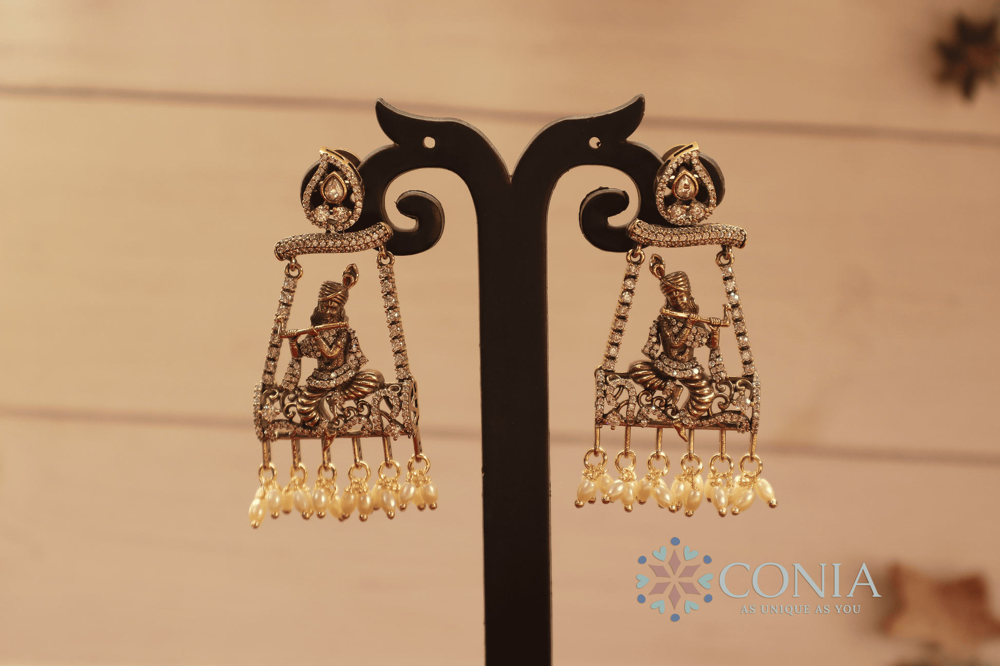 A divine blend of heritage and elegance, these Krishna motif danglers showcase a vintage gold look with stone embellishments and pearl drops, ideal for cultural events and weddings.