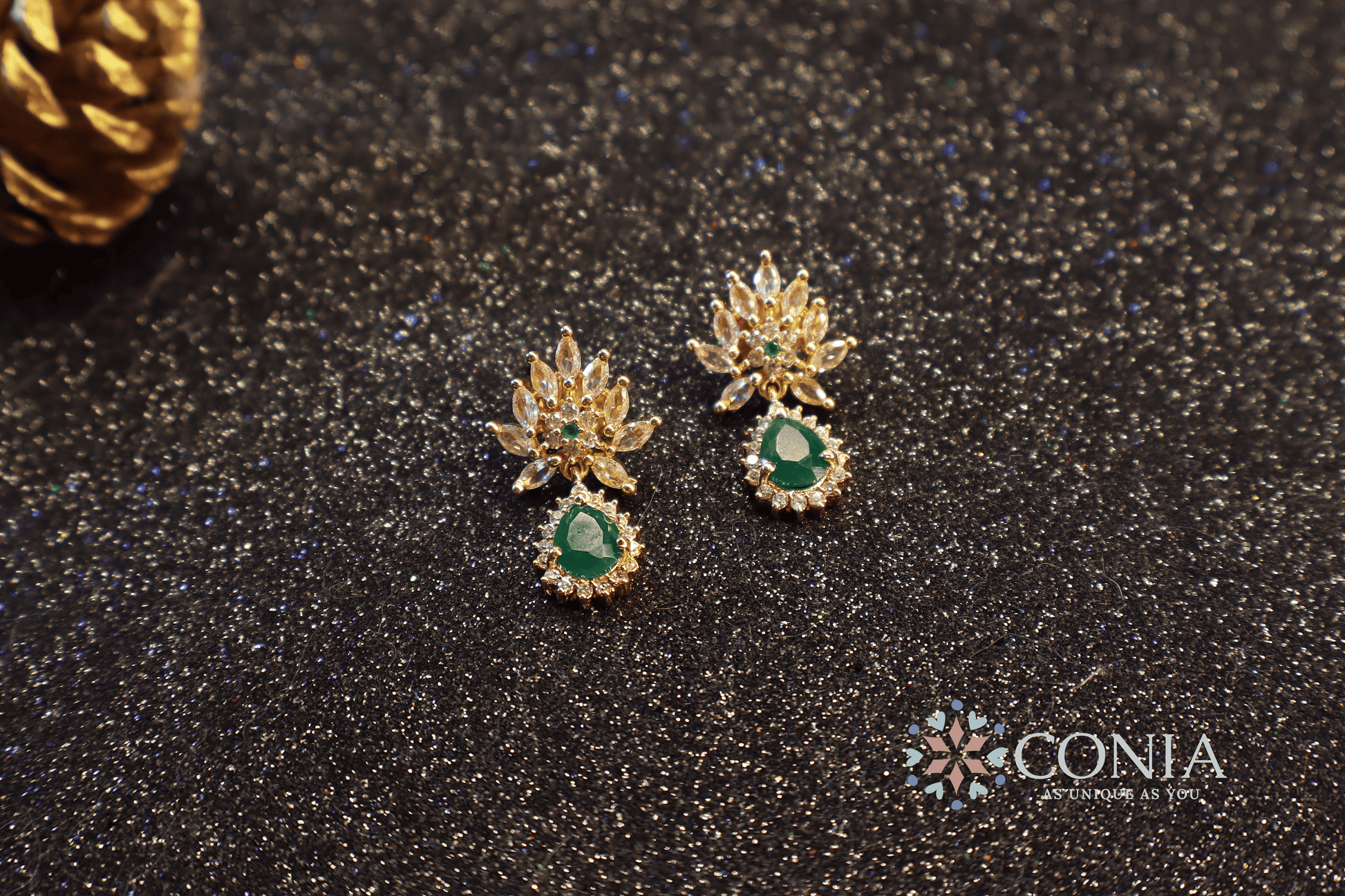 These elegant gold-toned earrings feature a floral cluster of sparkling stones, gracefully holding a teardrop-shaped blush green gem encircled with shimmering accents. Perfect for adding a touch of sophistication to both festive and formal looks.