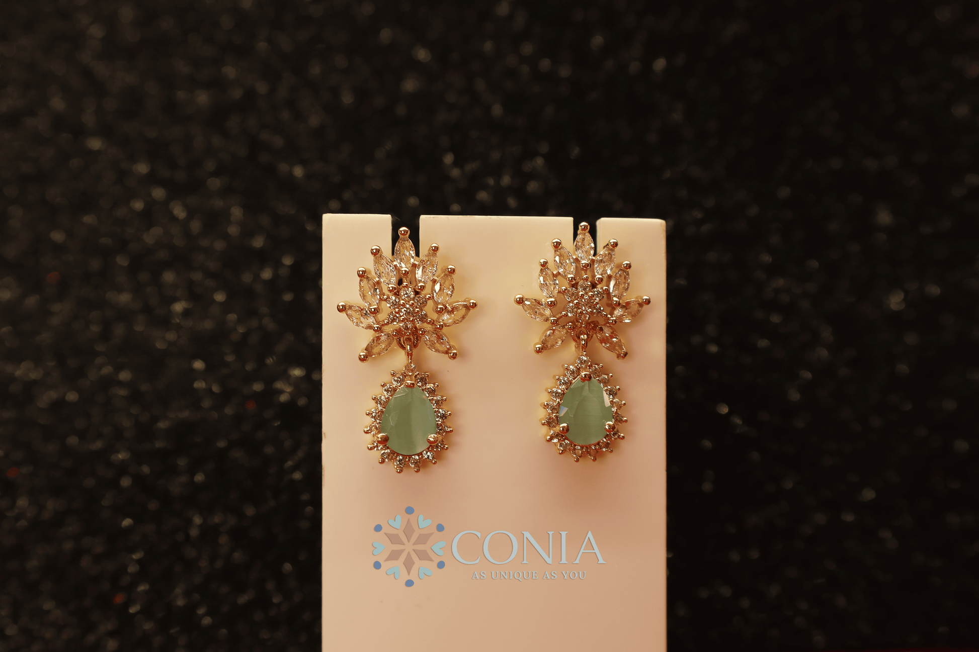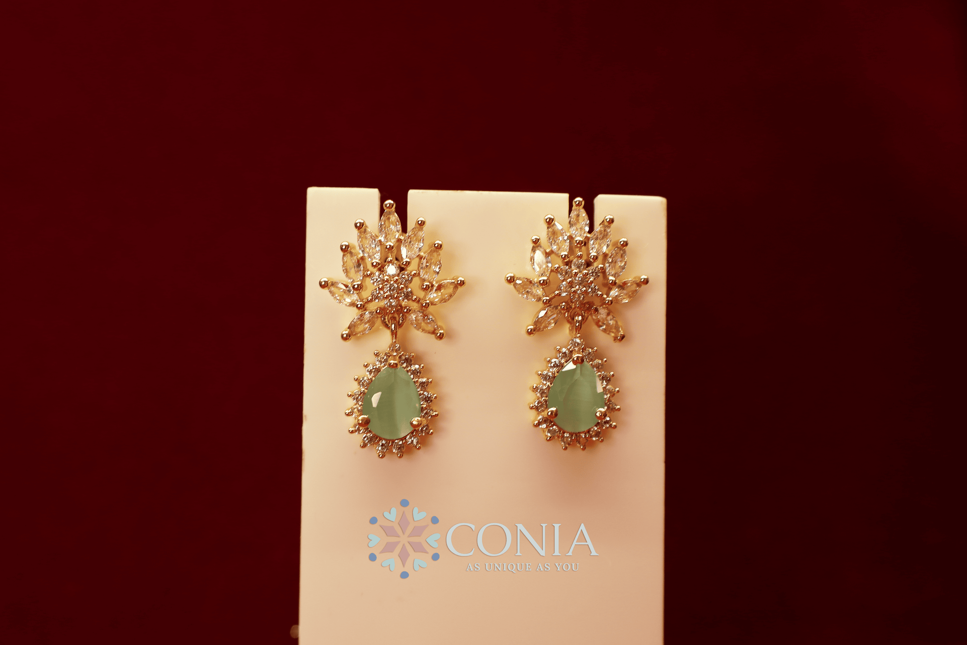 These elegant gold-toned earrings feature a floral cluster of sparkling stones, gracefully holding a teardrop-shaped blush Mint Green gem encircled with shimmering accents. Perfect for adding a touch of sophistication to both festive and formal looks.