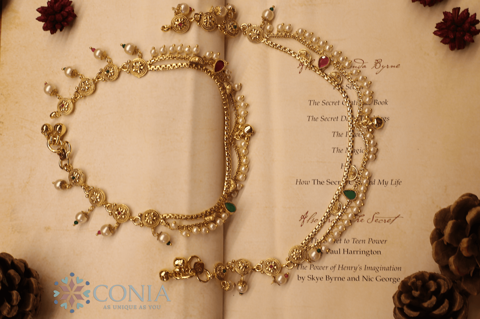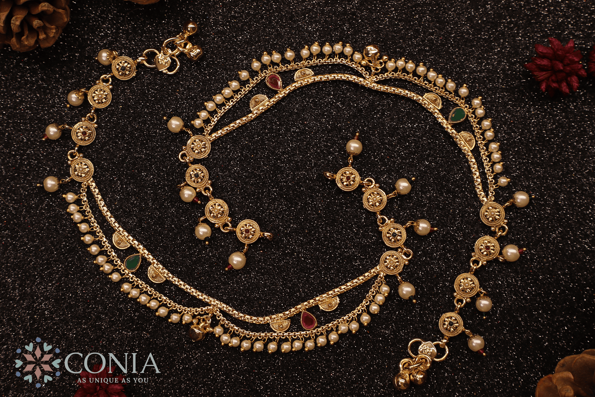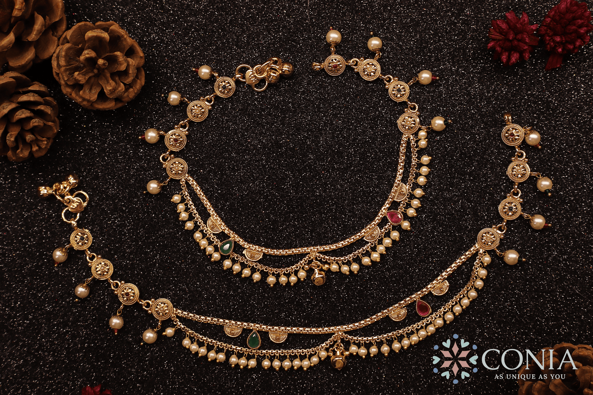 This exquisite gold-plated payal is a perfect blend of tradition and elegance, featuring intricate layered chains adorned with delicate pearls and ornate coin charms. Accented with vibrant green and red teardrop stones, it exudes a regal charm that complements ethnic and festive attire. The fine craftsmanship and detailed motifs add a royal touch, while the dangling ghungroos create a soft, melodious sound with every step. Ideal for weddings, cultural celebrations, and special occasions, this payal brings grace, beauty, and timeless appeal to your traditional look.