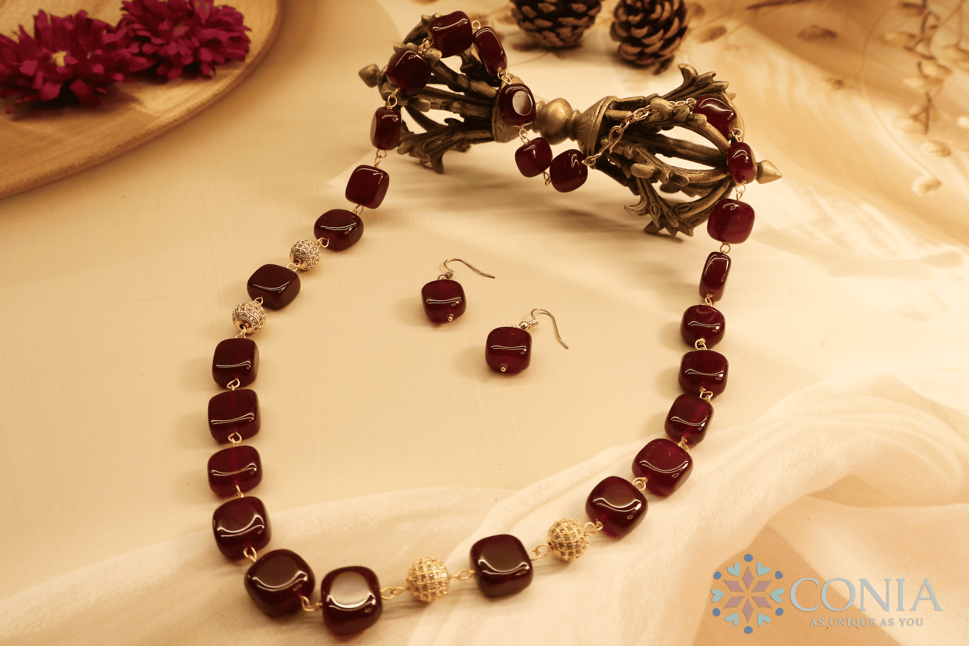 Elevate your style with the timeless charm of this "Midnight Elegance" Brown Stone Necklace. Featuring sleek, polished black square stones, this necklace is accented with shimmering golden filigree spheres that add a touch of opulence. Each element is carefully linked with delicate golden connectors, creating a sophisticated design that is perfect for both formal occasions and everyday elegance.