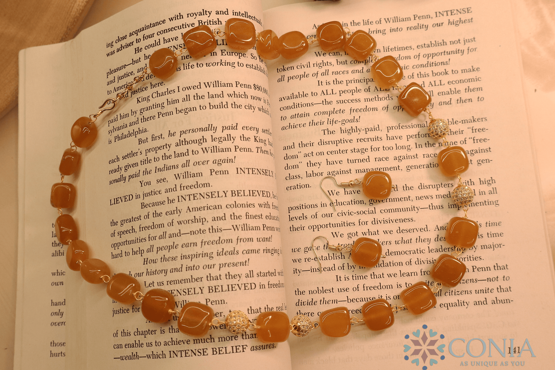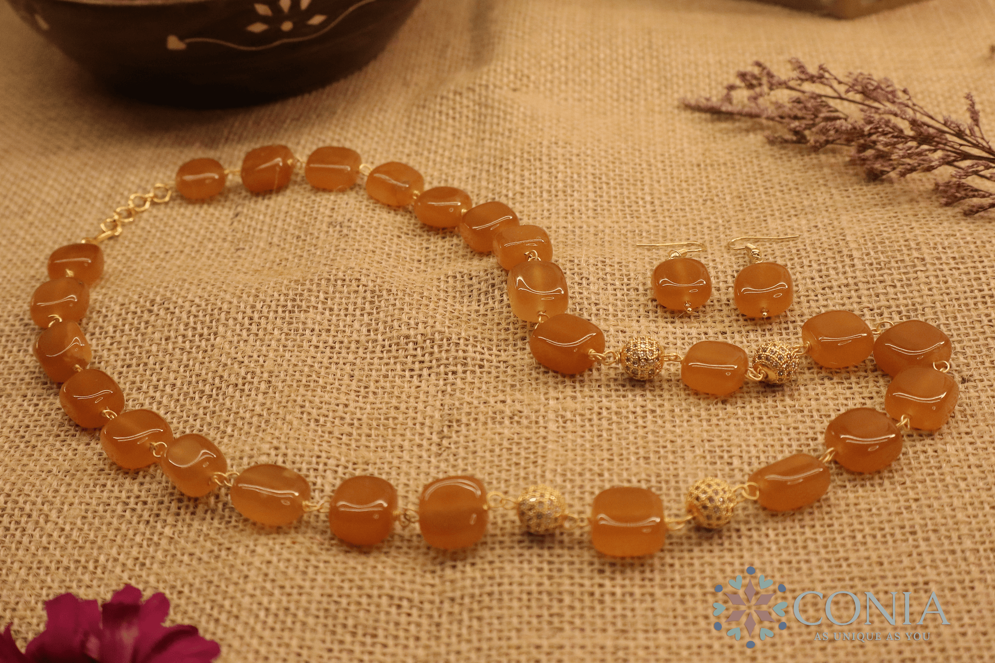 Elevate your style with the timeless charm of this "Midnight Elegance" Orange Stone Necklace. Featuring sleek, polished black square stones, this necklace is accented with shimmering golden filigree spheres that add a touch of opulence. Each element is carefully linked with delicate golden connectors, creating a sophisticated design that is perfect for both formal occasions and everyday elegance.