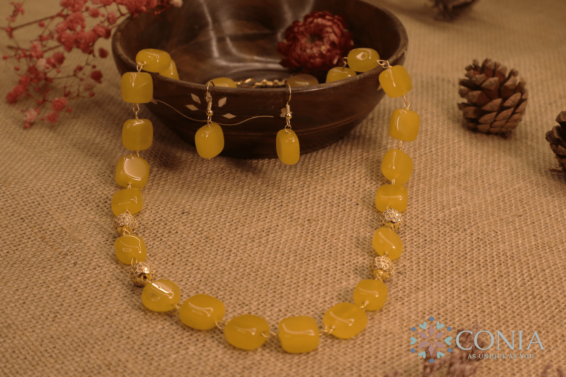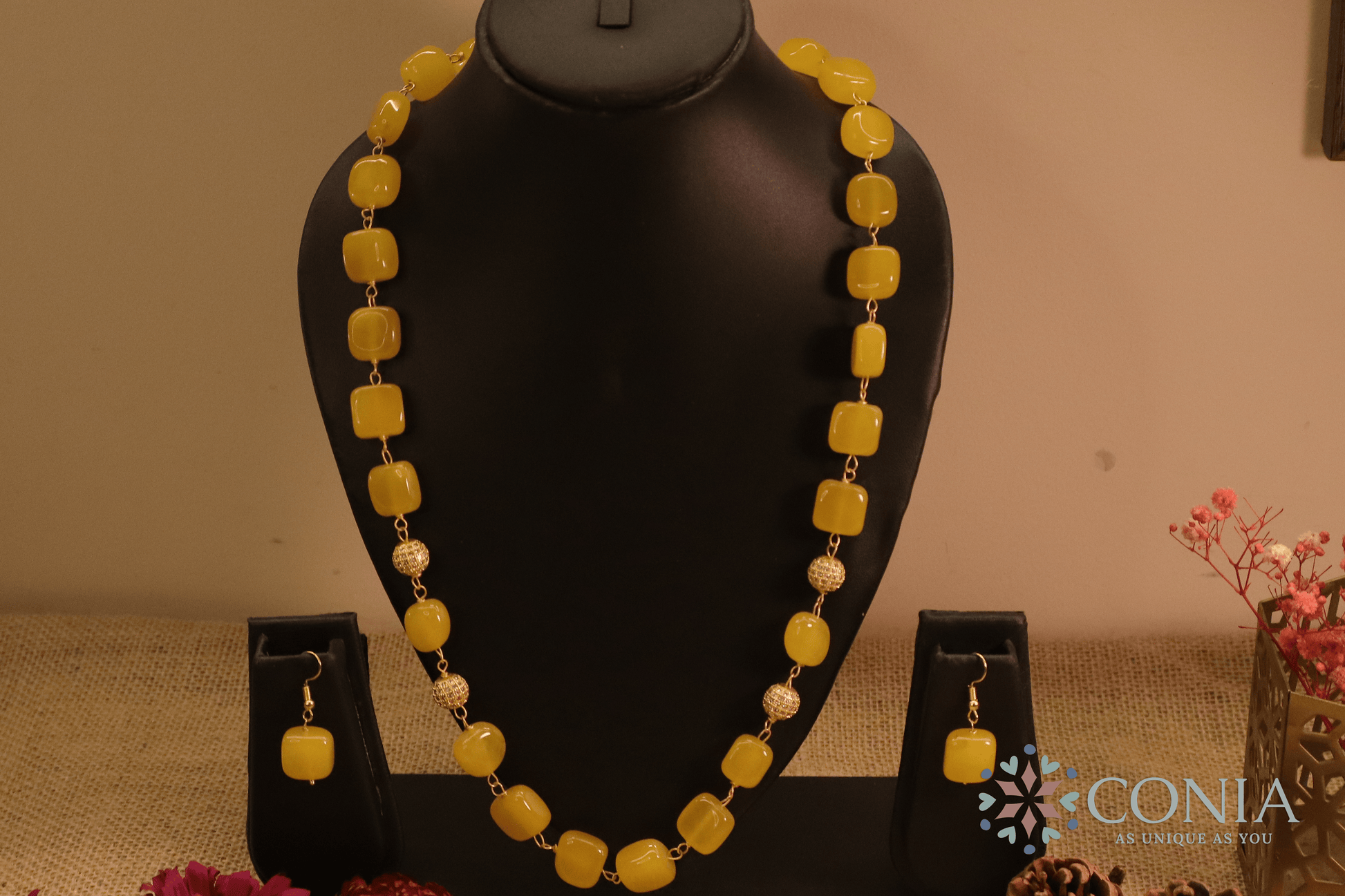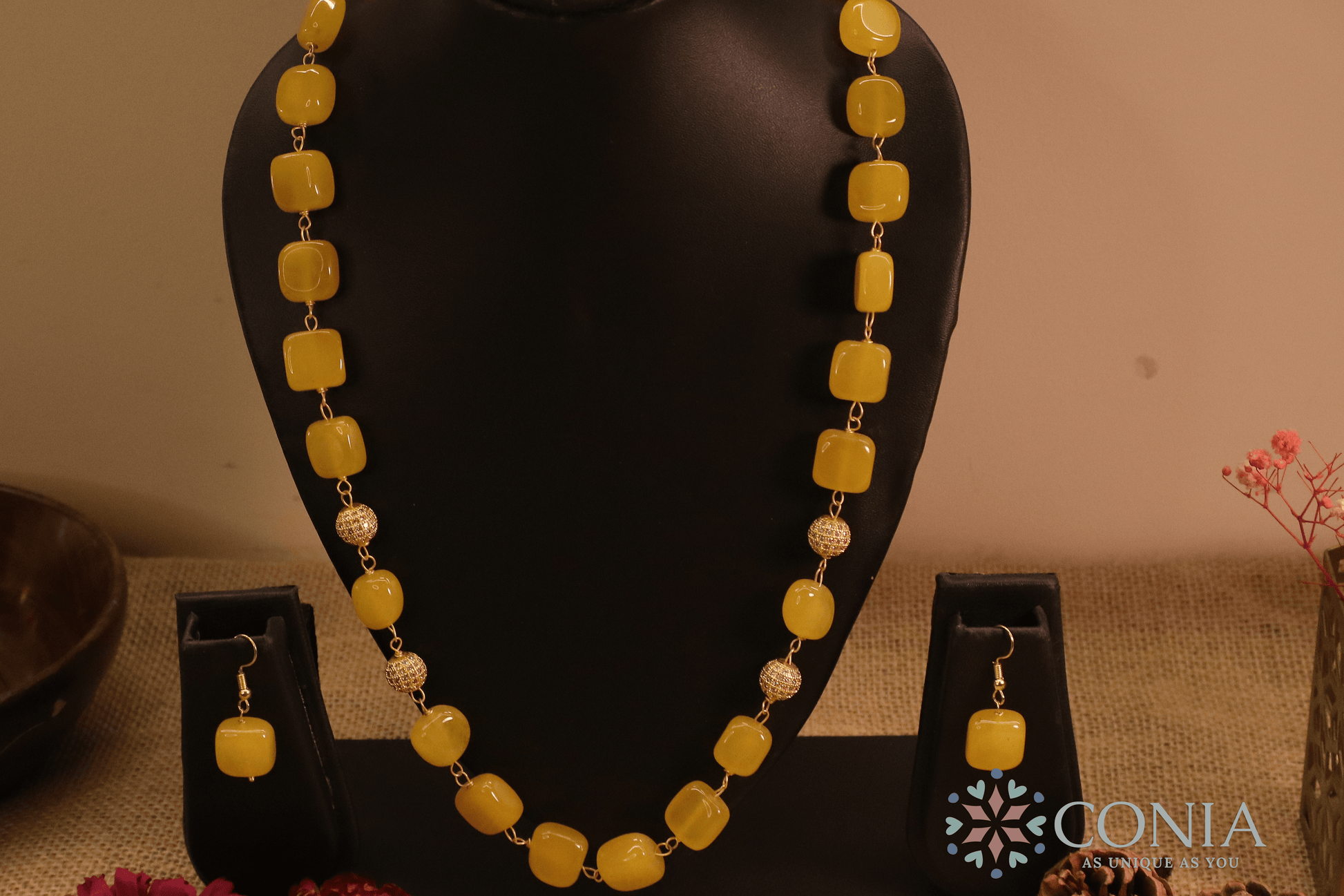 Elevate your style with the timeless charm of this "Midnight Elegance" Yellow Stone Necklace. Featuring sleek, polished black square stones, this necklace is accented with shimmering golden filigree spheres that add a touch of opulence. Each element is carefully linked with delicate golden connectors, creating a sophisticated design that is perfect for both formal occasions and everyday elegance.