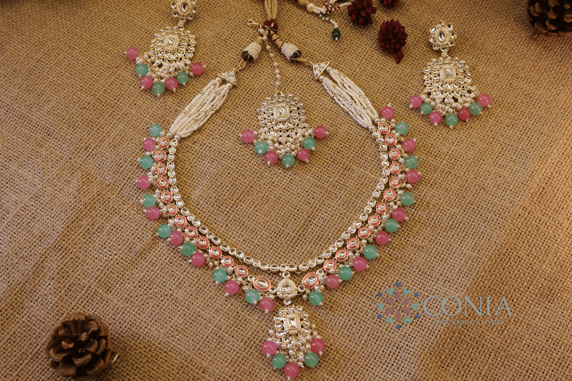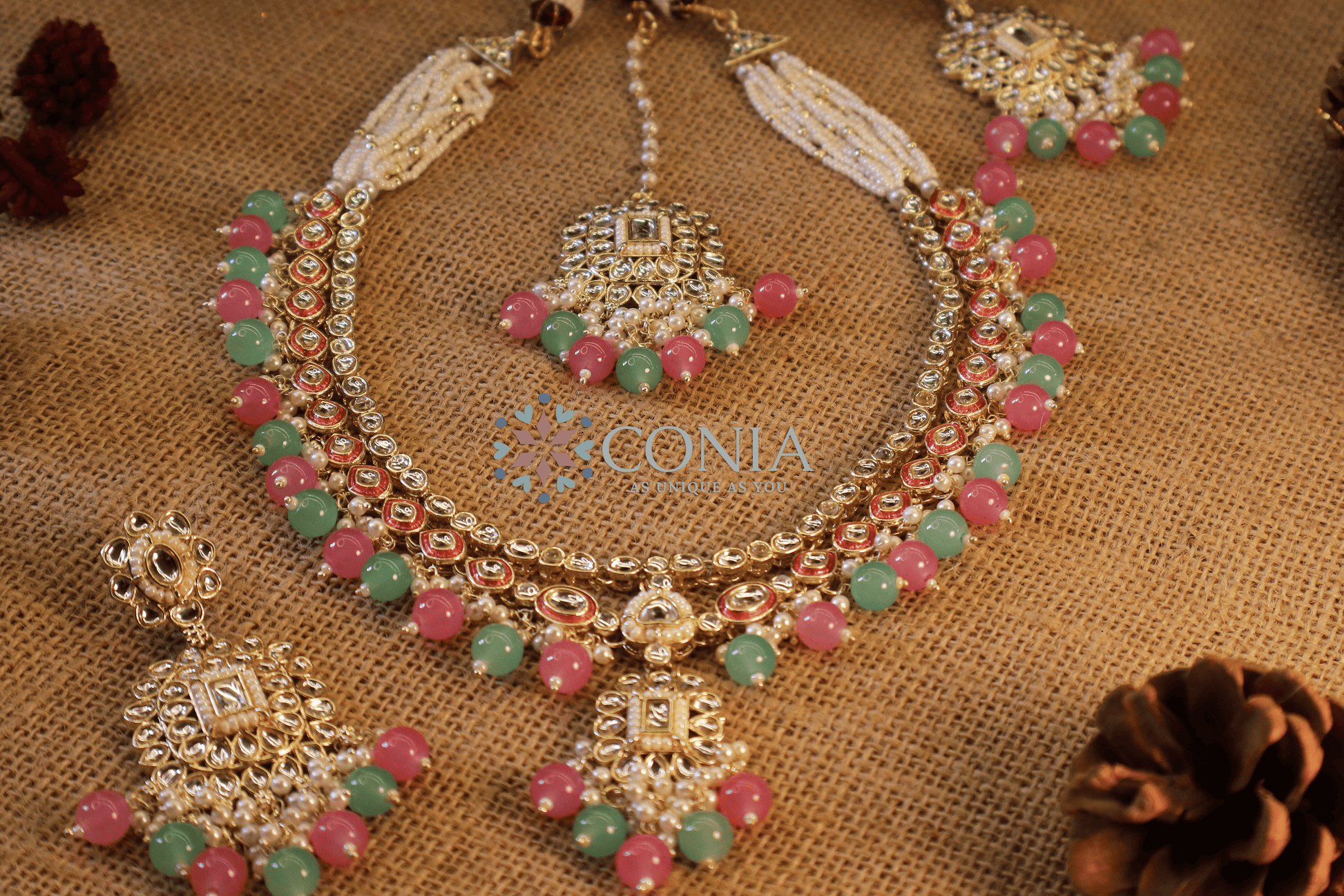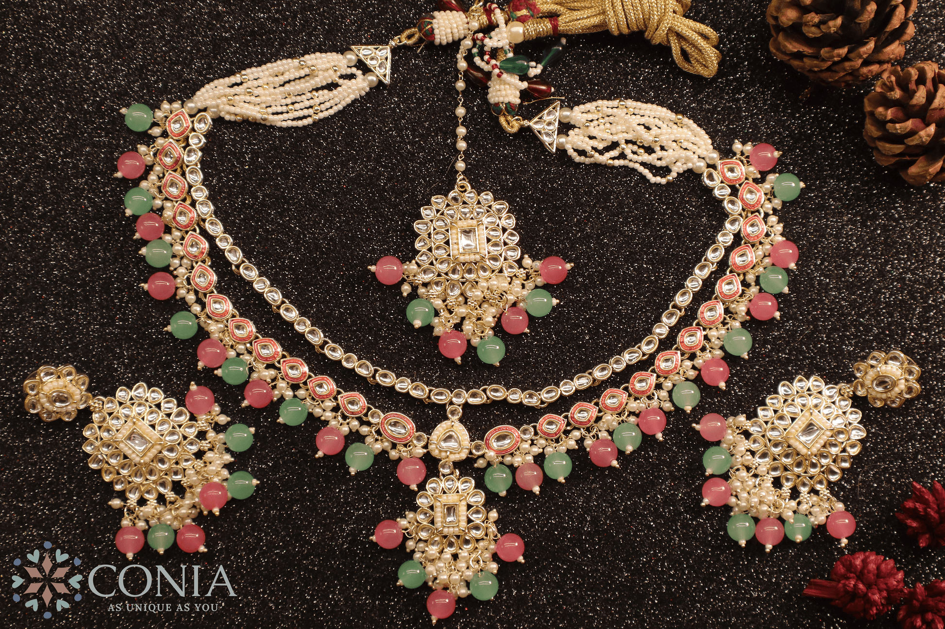 Accompanied by a matching pair of statement earrings, a maang tikka (forehead ornament), this set creates a cohesive and luxurious look. Perfect for weddings, festive occasions, or traditional ceremonies, Conia adds a touch of grandeur and sophistication to any ensemble.