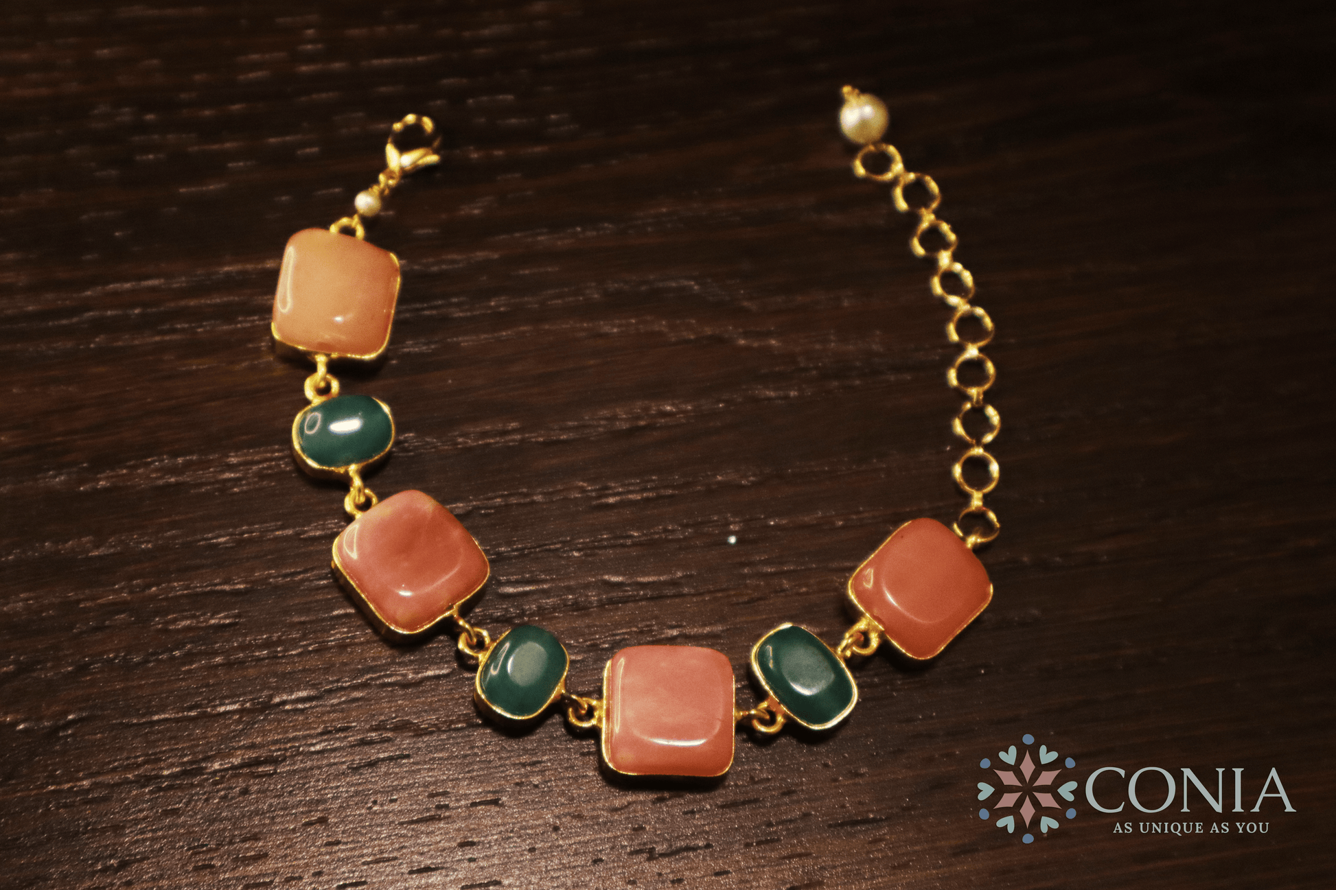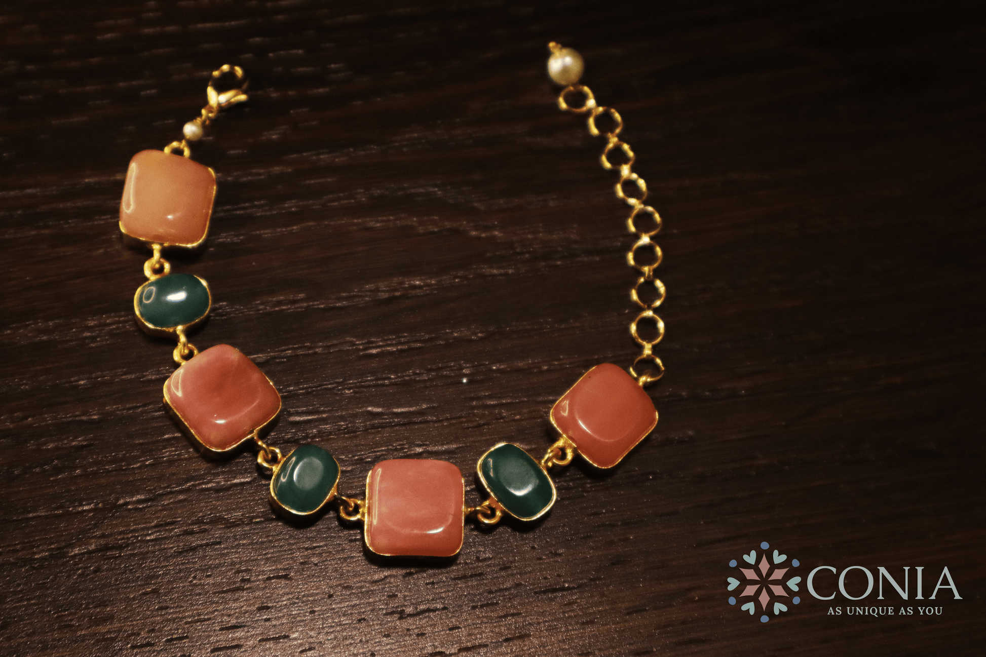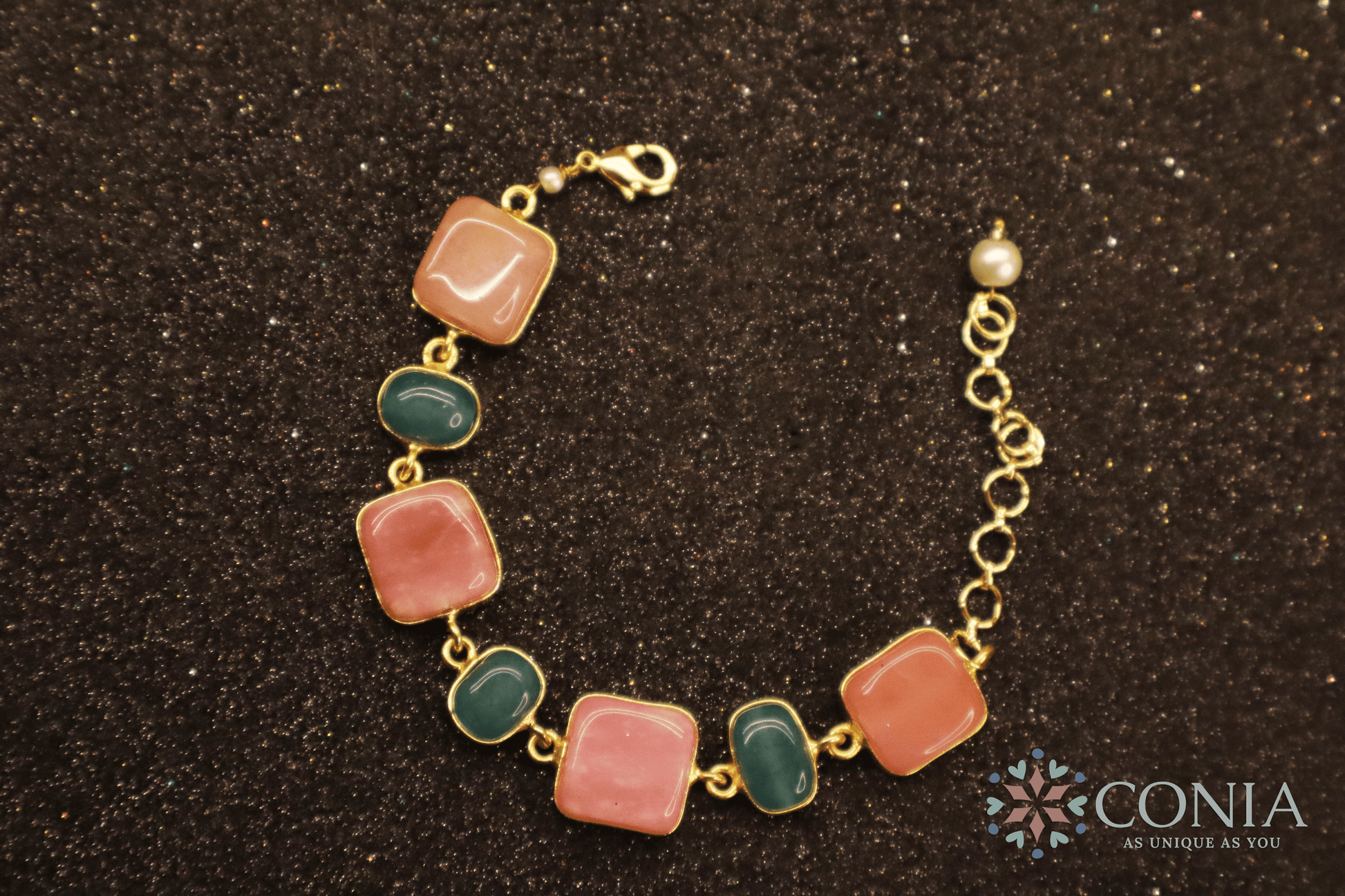 This Pink and Blue Stone Bracelet is a stunning blend of soft pastel hues, featuring alternating pink and blue stones set in a sleek gold-toned chain. The elegant design is lightweight and adjustable, making it perfect for everyday wear or adding a touch of sophistication to special occasions. The vibrant yet subtle colors offer a graceful and timeless appeal.