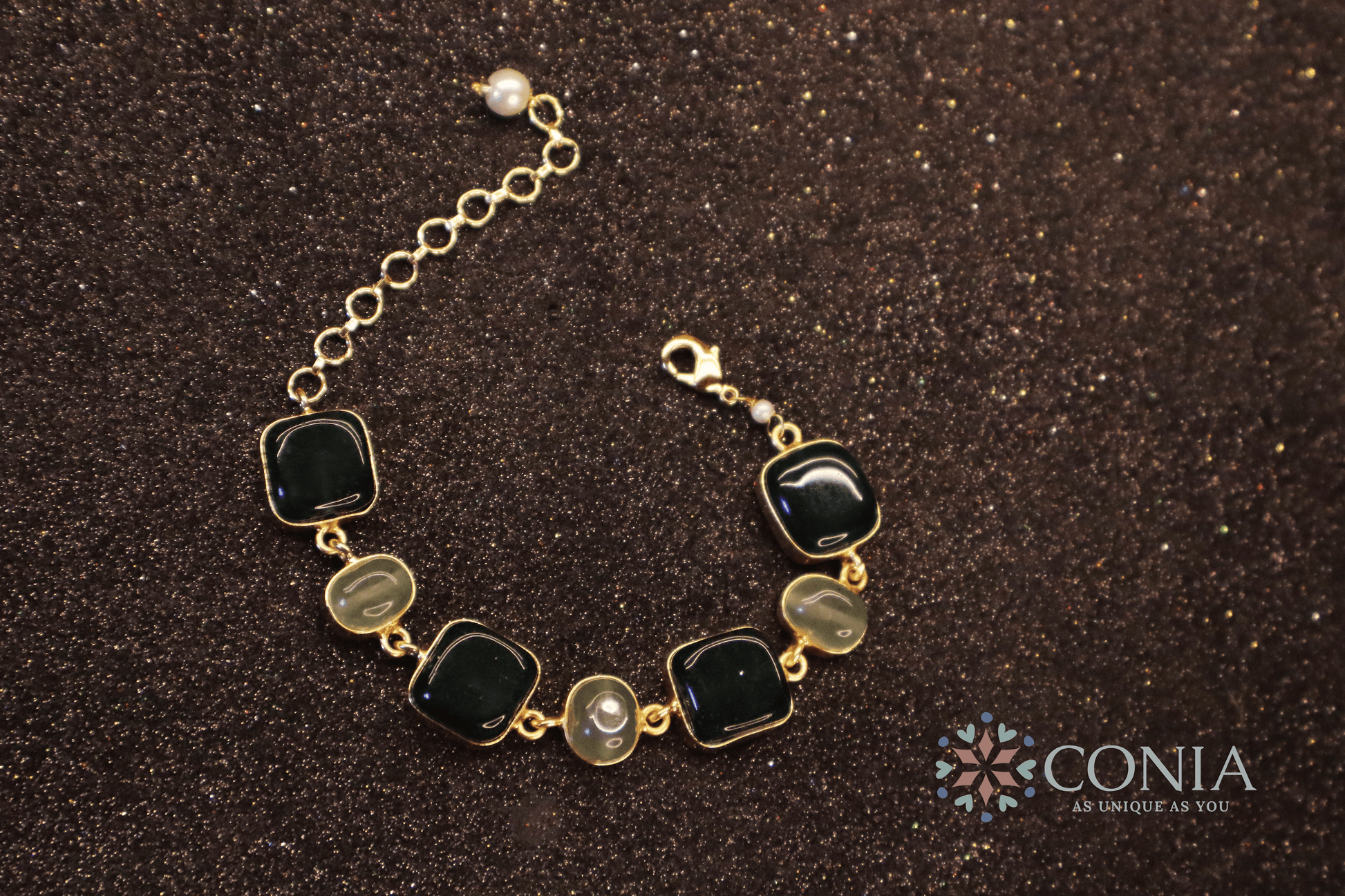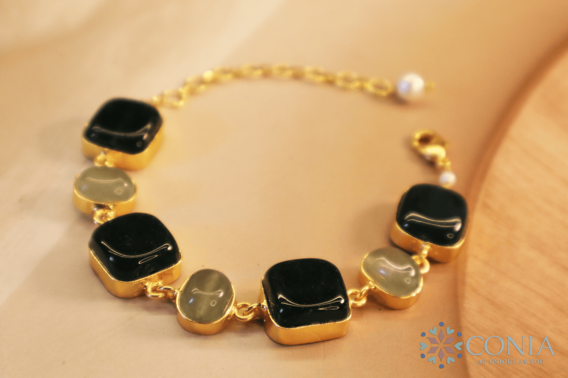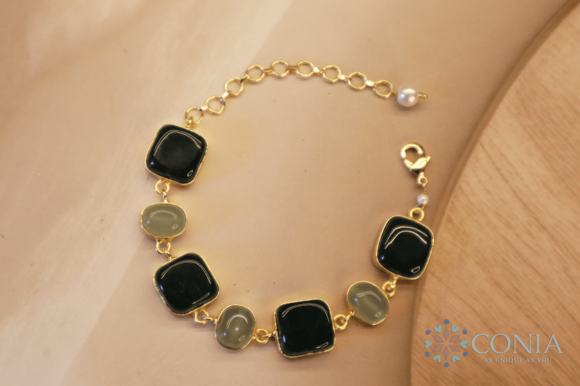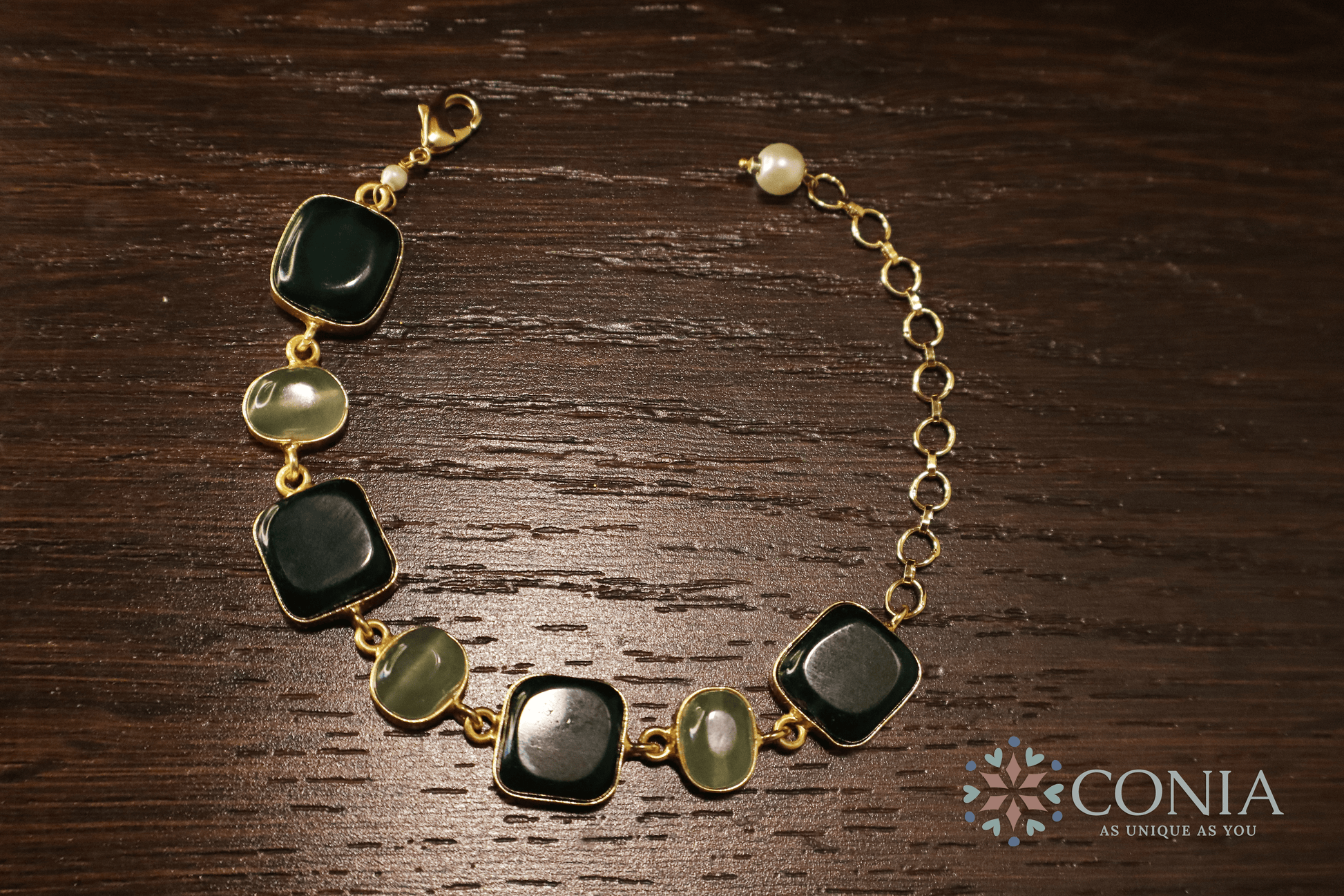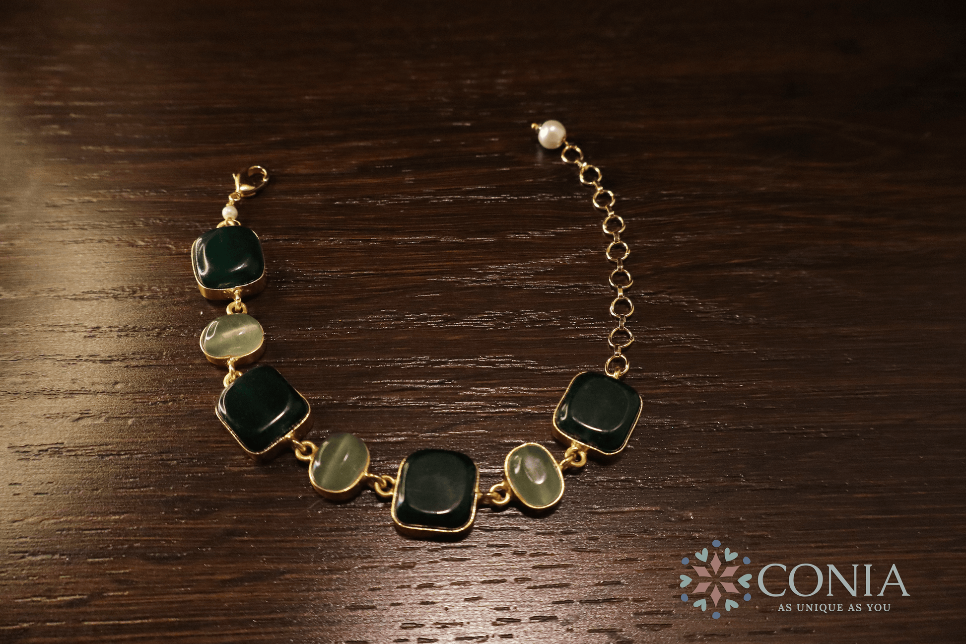 This Green Stone Bracelet is a stunning blend of soft pastel hues, featuring alternating pink and blue stones set in a sleek gold-toned chain. The elegant design is lightweight and adjustable, making it perfect for everyday wear or adding a touch of sophistication to special occasions. The vibrant yet subtle colors offer a graceful and timeless appeal.