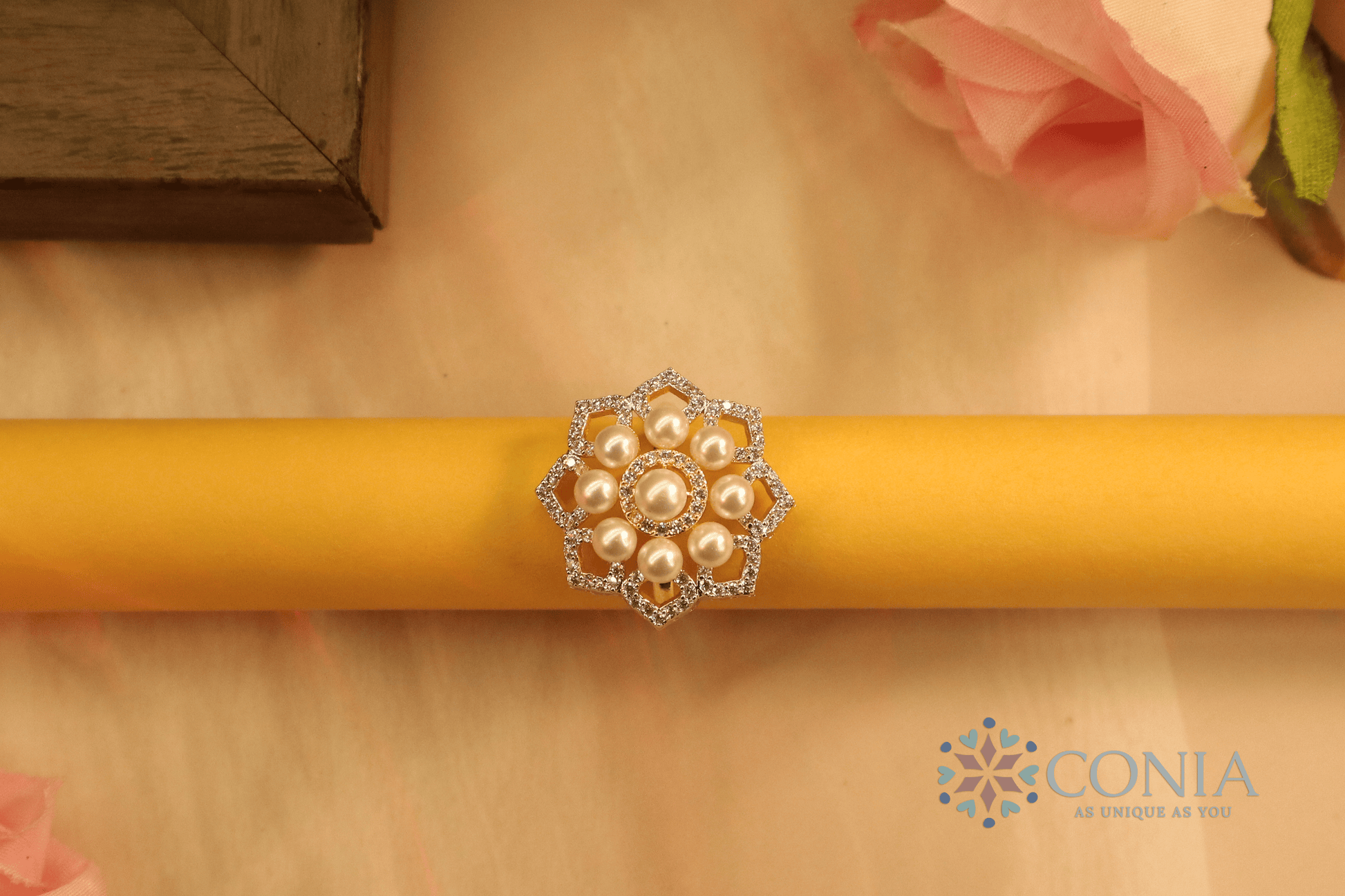 This elegant adjustable ring features a stunning cluster of luminous pearls encircled by shimmering American Diamonds, arranged in a floral-inspired, geometric design. With its delicate balance of pearls and sparkle, it exudes timeless sophistication, perfect for any special occasion. The adjustable band offers versatility, making this ring a graceful statement piece for both traditional and modern looks.