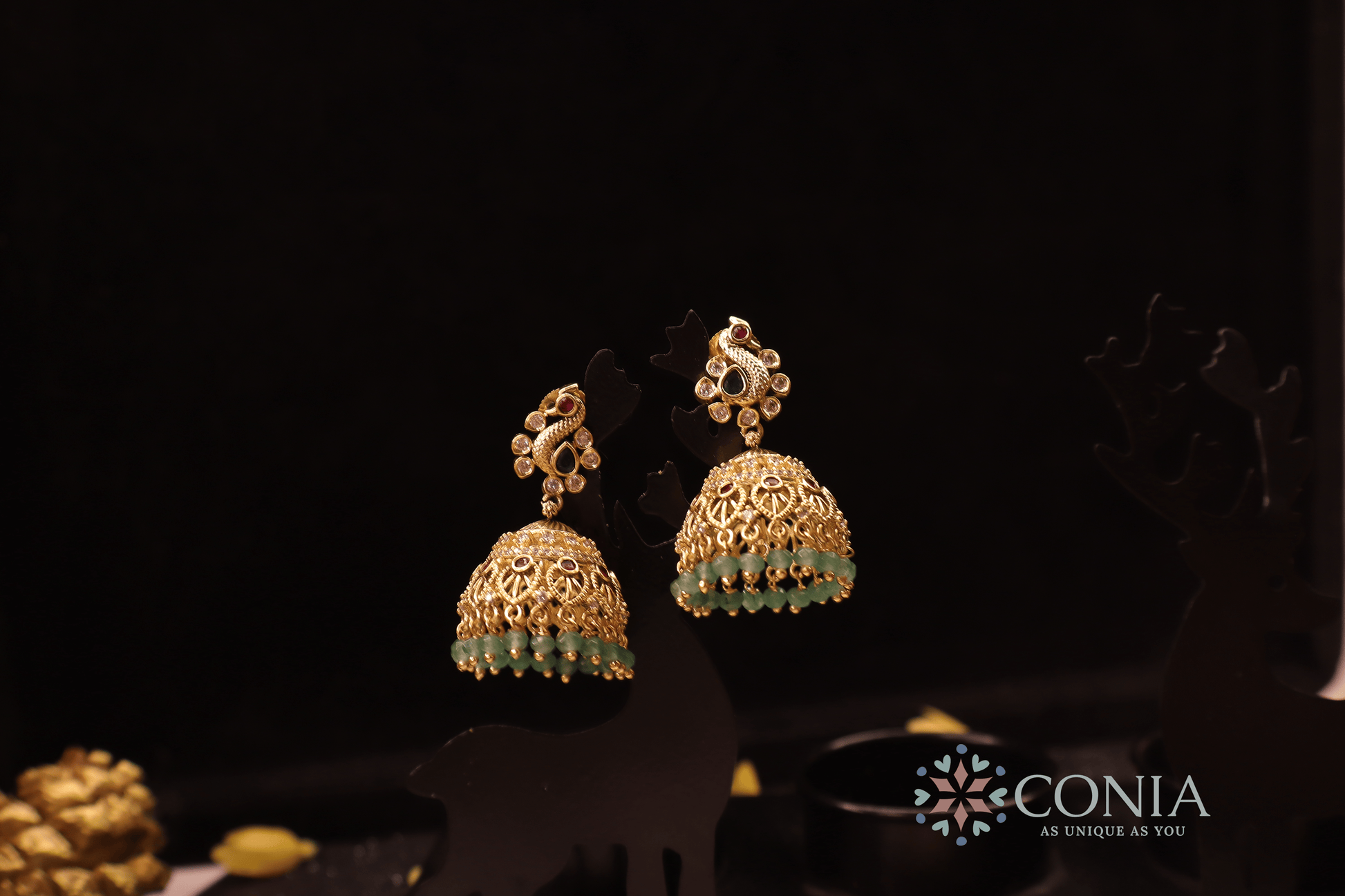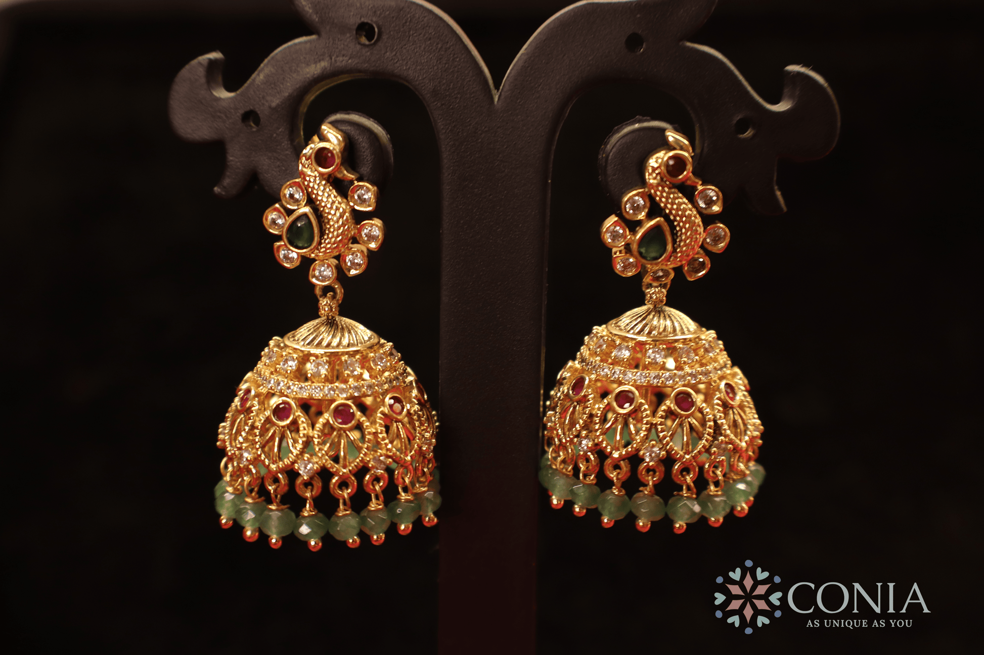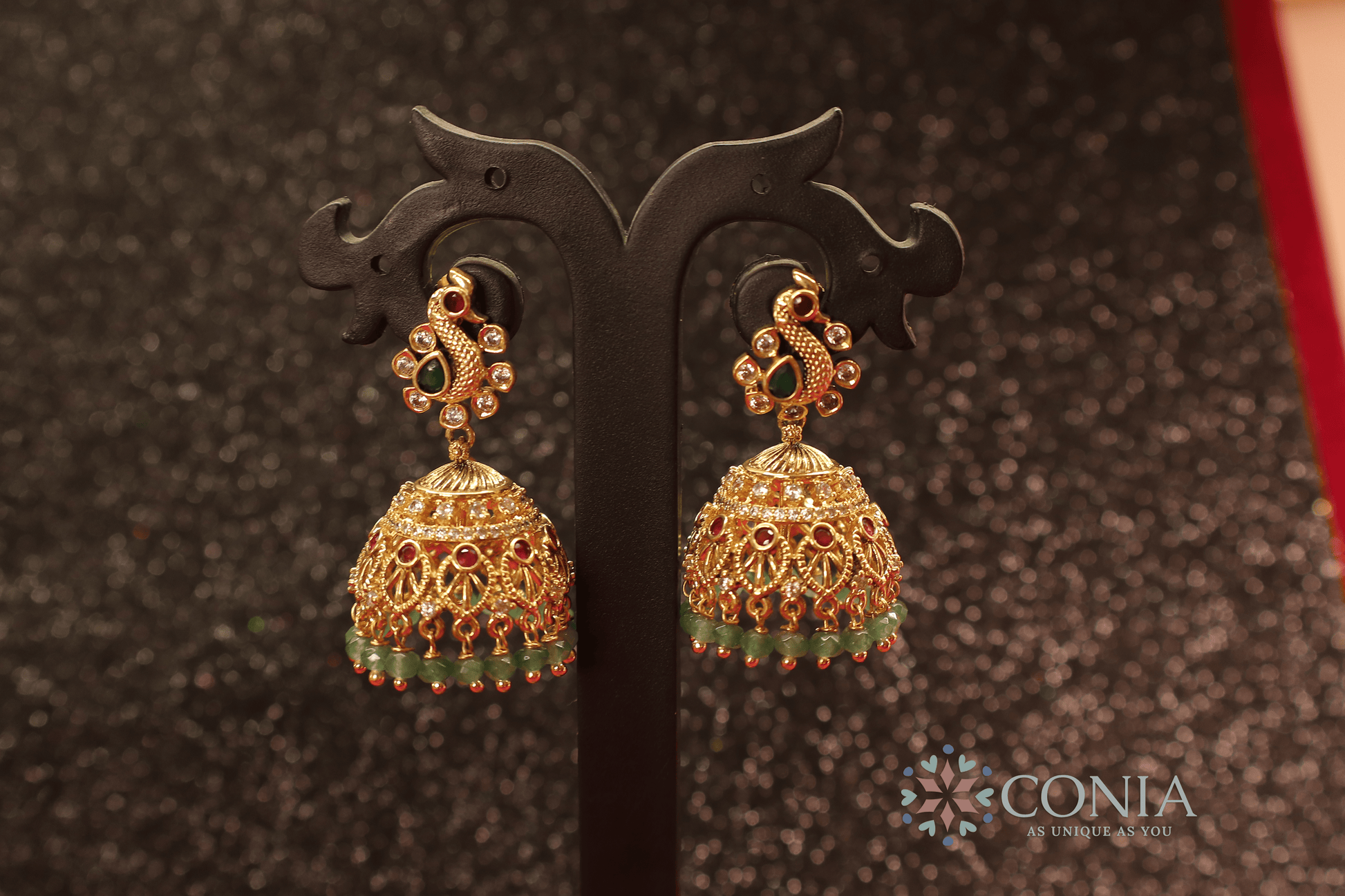 Inspired by timeless temple artistry, this Royal Peacock Jhumki gleams with ruby and emerald hues set in intricate gold filigree. A perfect companion for sarees and lehengas, it celebrates India’s regal jewelry heritage.