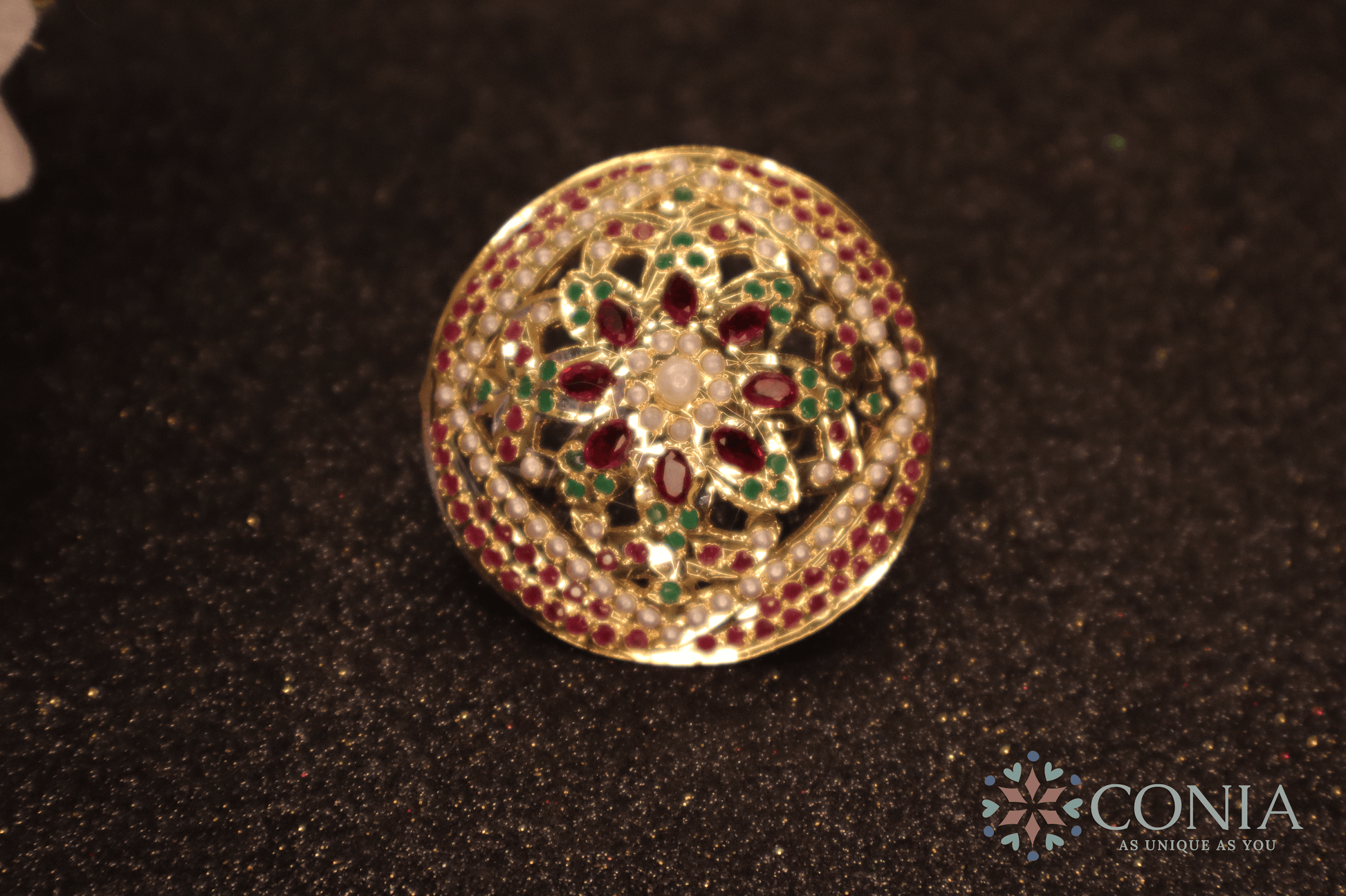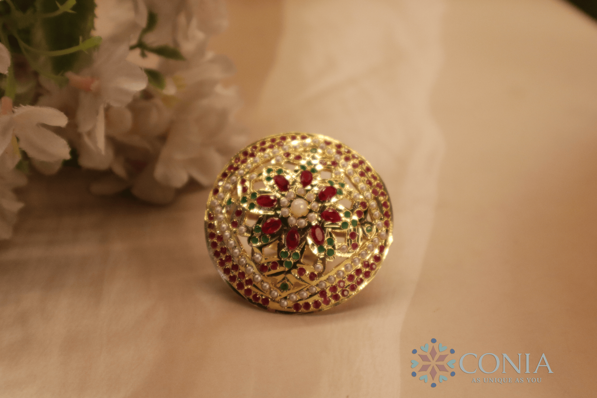 This adjustable Jadau ring features a floral-inspired design crafted with precision. Lustrous rubies, emerald accents, and pearls are set in a rich gold base, creating a timeless piece of artistry. Its adjustable band ensures both comfort and versatility, making it ideal for grand celebrations.