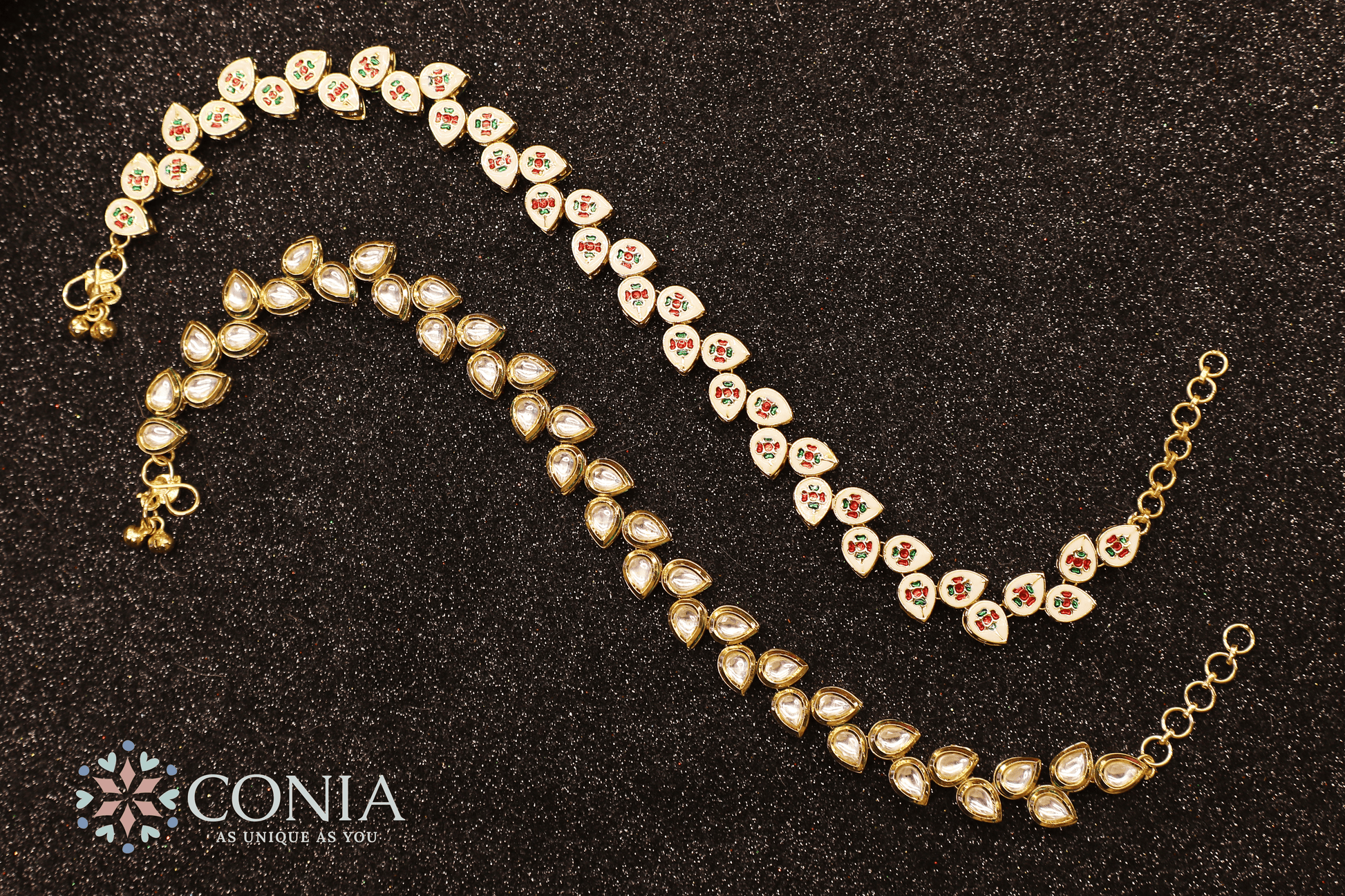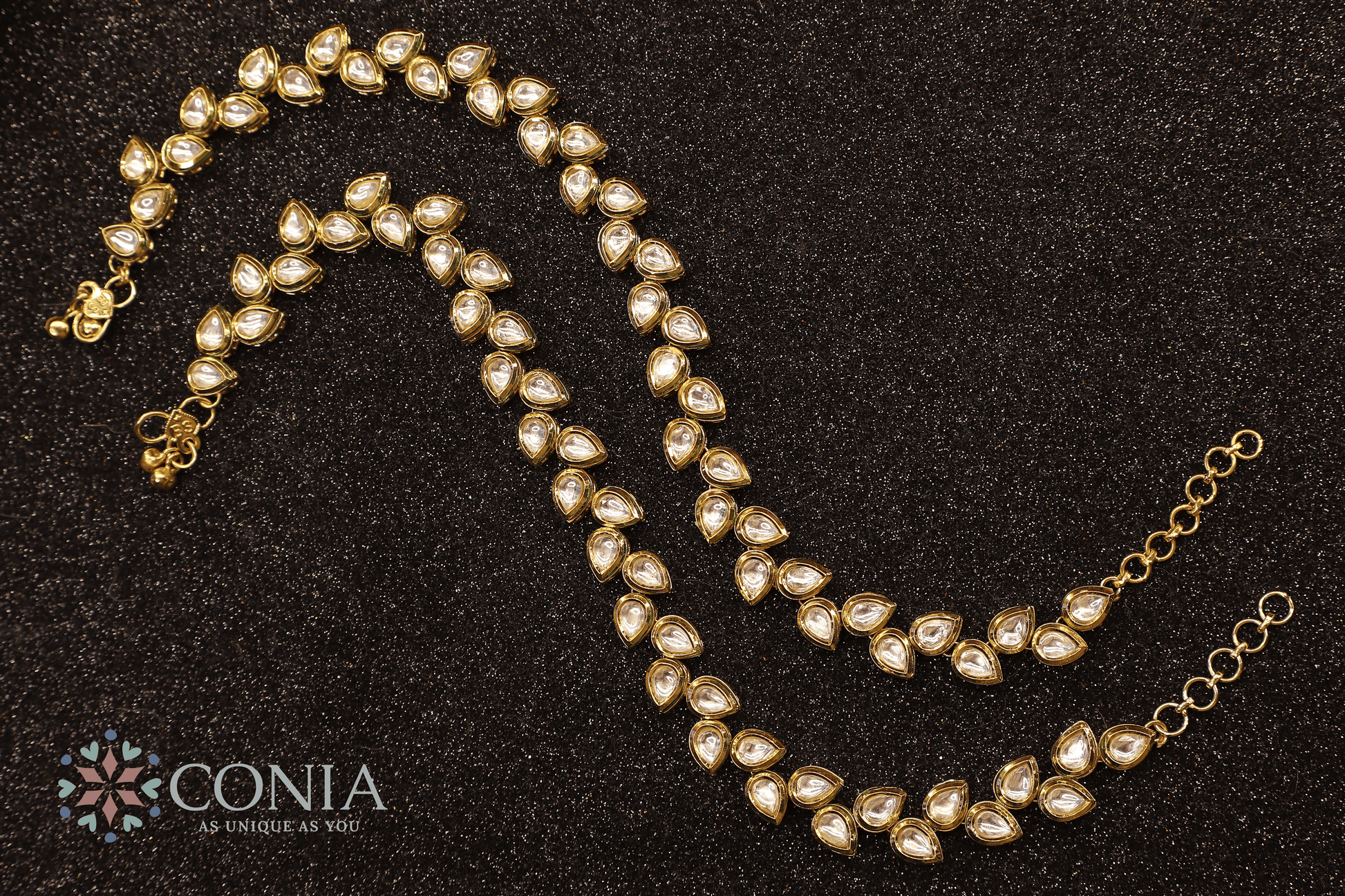 Gold-plated kundan payal featuring delicate teardrop stones, crafted to bring a graceful, traditional touch to your look. This exquisite gold-plated kundan payal is beautifully handcrafted with shimmering teardrop-shaped stones, each set in a rich golden frame. The intricate design combines traditional artistry with timeless elegance, making it a perfect accessory for weddings, festive celebrations, and special occasions. Its lustrous gold plating enhances the brilliance of the kundan work, adding a royal charm and graceful movement to every step you take.